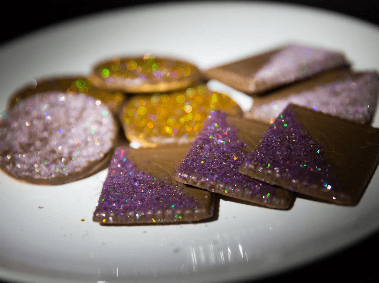 Fully edible jewel-like flakes with a stunning prismatic effect for your creations. They are available in a variety of colours and include a range using natural plant-based colourings. Simply sprinkle them on dry food surfaces such as cakes, chocolates, biscuits, crisps, cupcakes, cookies, popcorn and much more. As they are made of food ingredients, they dissolve on wet surfaces just like they should in your tummy! Explore our magical colour range by clicking on the swatches below.
